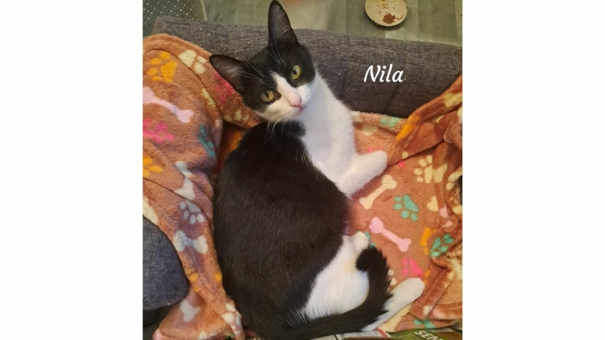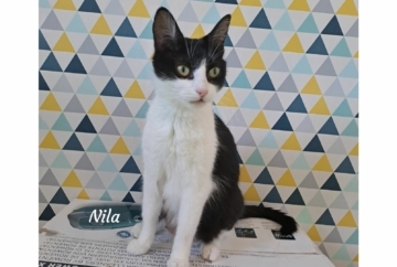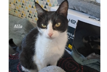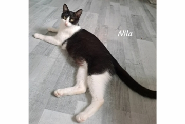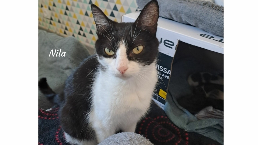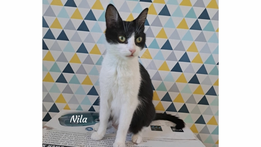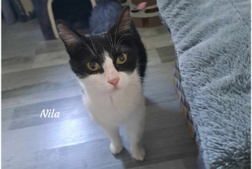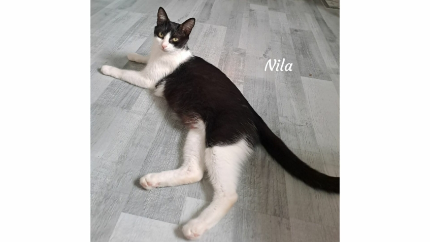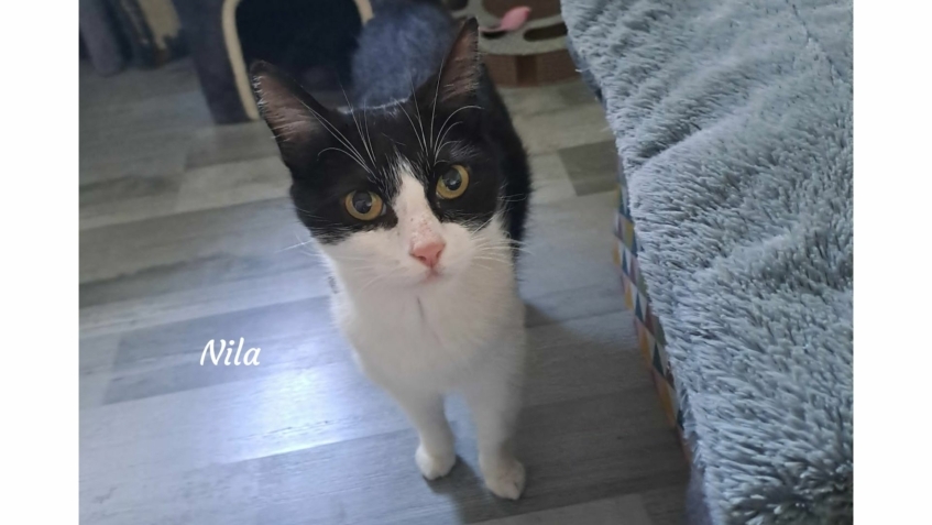 Salut, moi c’est Nila et je suis sociable, câline, joueuse… et une vraie petite maman courage 🐾🖤🤍